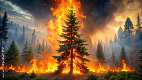 A majestic fir tree engulfed in a raging forest fire with flames licking its branches , fir tree
