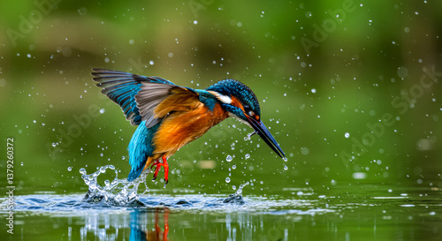 A majestic kingfisher descends into the river, beak first, shattering the calm surface. The splash radiates outward in crisp detail, framed in a cinematic wildlife shot.