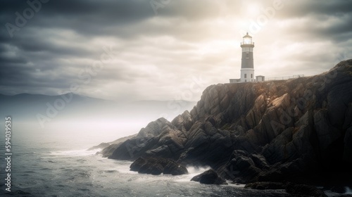A majestic lighthouse guiding ships along a rocky coastline, with copyspace in the sweeping beam of light. Generative ai.