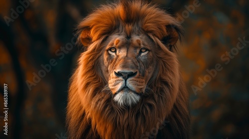 A majestic lion with an impressive mane stands against the backdrop of its natural habitat