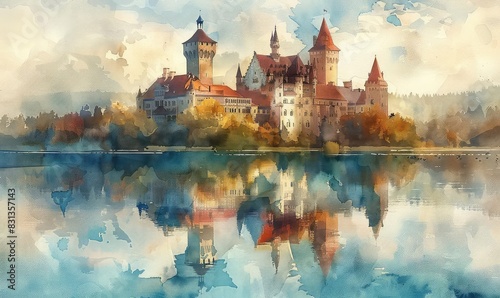 A majestic medieval castle by a tranquil lake, with its reflection in the water, serene and picturesque, soft pastel colors, watercolor technique,