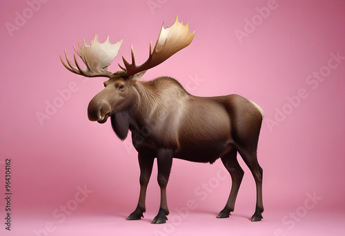 A majestic moose standing against a soft pink background. The moose has large, impressive antlers