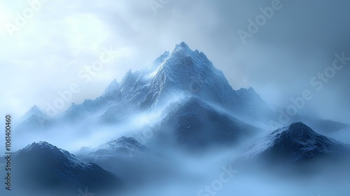 A majestic mountain peak rises through a misty, snowy landscape, surrounded by soft, rolling hills under a serene blue sky.