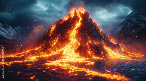A majestic mountain towers over a fiery lava river flowing down its sides, creating a striking contrast against a deep blue sky, illuminating the landscape with dramatic light