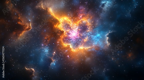 A majestic nebula in the sky of a futuristic space setting with colorful cosmic elements and celestial bodies surrounding it