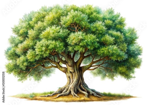 A majestic olive tree, finely detailed branches, set against a crisp white background, a botanical fine art print.