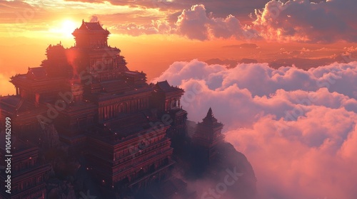 A majestic palace perched high atop a mountain, shrouded in clouds as the sun sets behind it, casting a golden glow over the scene.