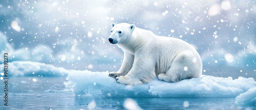 A majestic polar bear resting on an ice floe, surrounded by falling snowflakes in a serene arctic landscape.