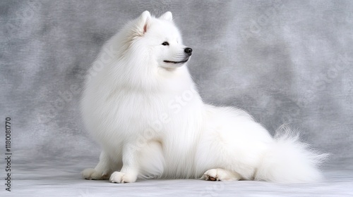 A majestic Samoyed sits with its fluffy coat perfectly groomed, glowing against a white backdrop, full of warmth and friendliness