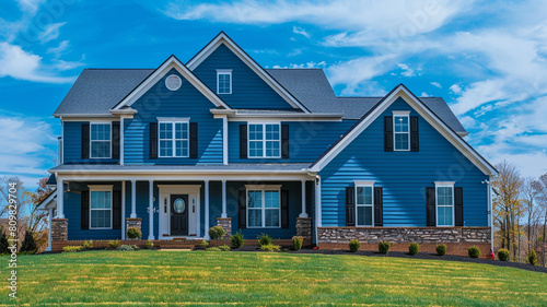 A majestic sapphire blue house adorned with siding and shutters stands proudly on a large lot in the suburban subdivision, commanding attention against the vibrant blue sky.