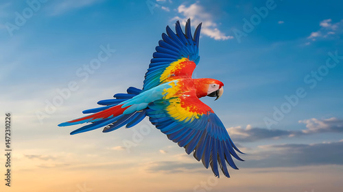 A majestic scarlet macaw soaring through a beautiful blue sky with open wings