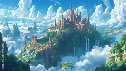 A majestic, sprawling castle perched atop a cloud-covered mountain, with cascading waterfalls on either side.
