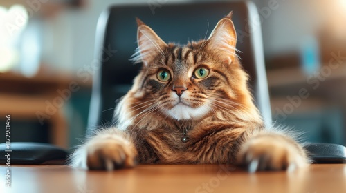 A majestic tabby cat confidently rests its forepaws on the edge of a desk chair, portraying a charming tableau of authority and feline intelligence in a workplace scene.