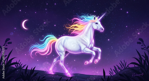 A majestic white unicorn with a glowing rainbow mane prances under a starry night sky with a crescent moon.