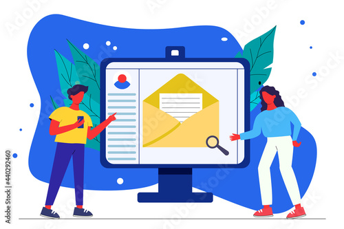 A male and female colleagues are standing near the computer. Work email, brainstorming, collaboration. Business Meeting Teamwork Concept.