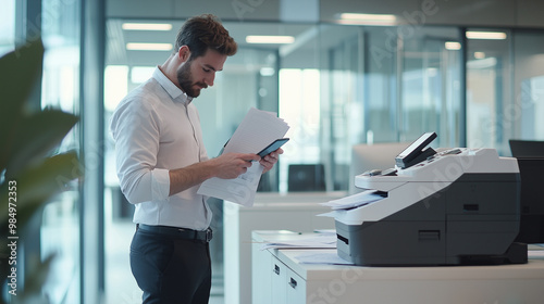 A male assistant standing by a copy machine, organizing paperwork and multitasking with a phone in hand, in a modern office environment photo