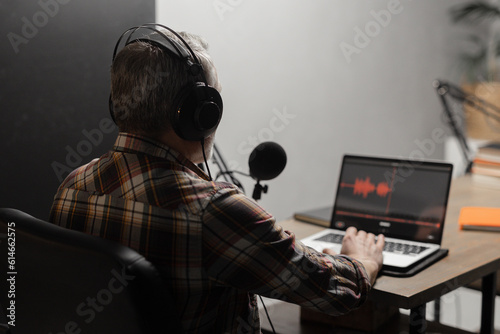 A male blogger is sitting in his room in front of a laptop and recording a podcast. A gray-haired man in headphones records his voice to evaluate the quality of the new microphone.