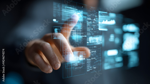 A male figure interacts with a futuristic digital interface, showcasing vibrant data and holographic projections.