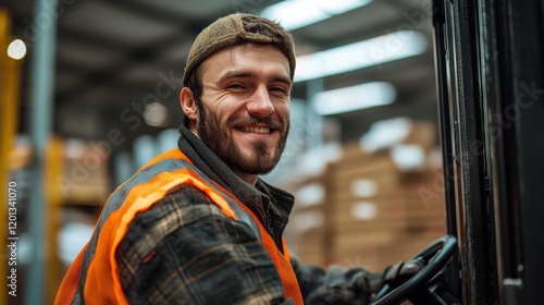 A male forklift operator with a strong build, wearing safety gear and smiling while operating the machine in a brightly lit warehouse.