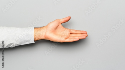 A male hand extended in a gesture of support, close-up with grey background, space for text, emphasizing aid, compassion, and connection