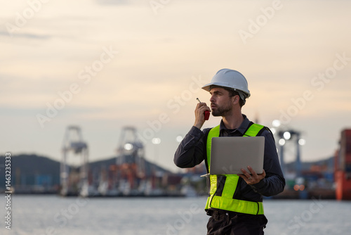 A male port engineer wearing a safety vest and helmet holds a laptop and talks on a radio at a busy shipping dock, overseeing cargo operations with cranes and containers in the background.