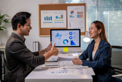 A man and a woman are sitting at a desk with a computer monitor in front of them