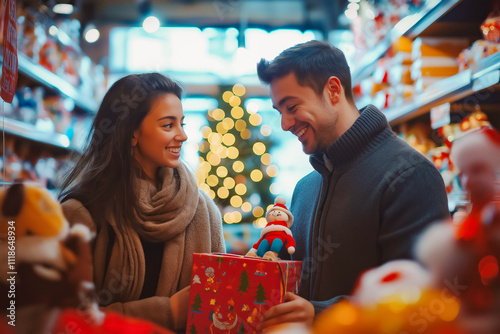 A man and a woman in a store in a shopping center choose gifts for Christmas