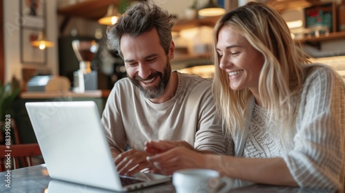 A man and woman are sitting at a table looking at a laptop