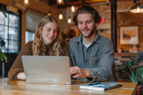 A man and woman sitting at a table with a laptop, looking over paperwork and smiling.