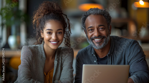 A man and woman smile at the camera in a welcoming café setting with warm light