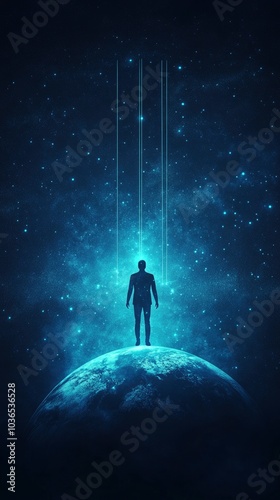 A man being controlled by puppet strings above the Earth, glowing with a blue light against a dark background, representing a business concept.