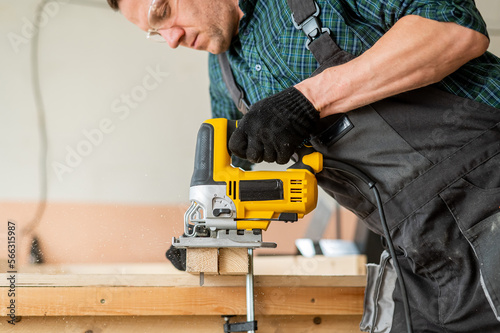 A man cuts a wooden plank with an electric jigsaw in a workshop.