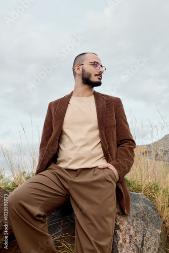 A man dressed in chic autumn attire stands confidently in a tranquil field, embracing the season beauty.