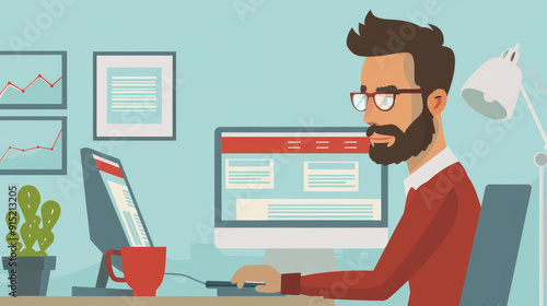 A man focuses on work at his desk with multiple monitors, a coffee mug, and indoor plants nearby