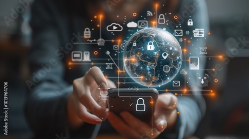 a man holding a Smartphone with Globe, Finance, Cloud Computing, and Security Icons, mobile banking or online financial technology concept