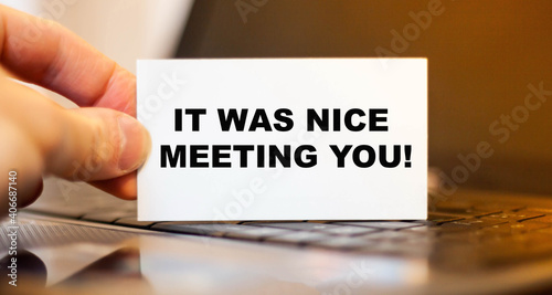 A man holds a business card with the words IT WAS NICE MEETING YOU