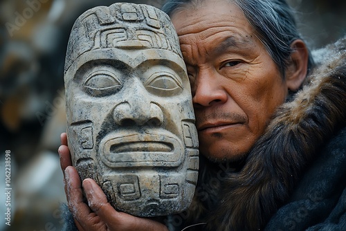 A man holds a weathered stone mask, his expression reflecting a deep connection to ancient traditions.