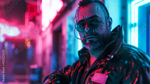 A man in a black jacket and sunglasses standing in front of a neon sign