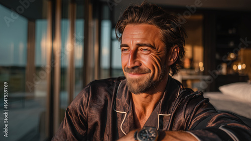 A man in a black robe is smiling and wearing a watch. He is sitting on a bed in a room with a window