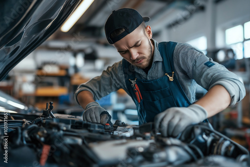A man in a blue jumpsuit is working on a car engine