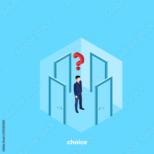 a man in a business suit stands in a room with four doors and thinks which one to go to, an isometric image