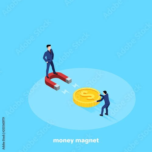 a man in a business suit stands on a large magnet that attracts a gold coin, an isometric image