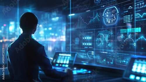 A man in a dark control room analyzing data displayed on numerous high-tech screens. The soft blue and purple light creates a futuristic ambiance, ideal for technology and data management themes.