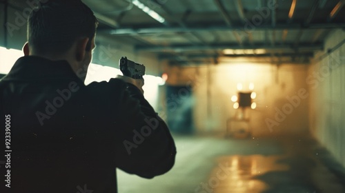 A man in a dimly lit shooting range focuses on his target, illustrating precision and intense concentration in an industrial setting.