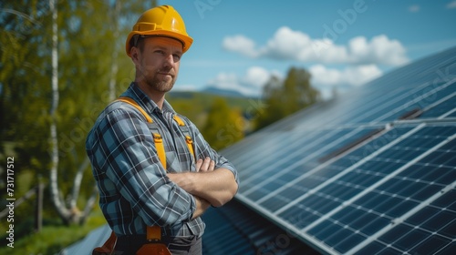 a man in a hard hat and orange helmet stands in front of solar panels