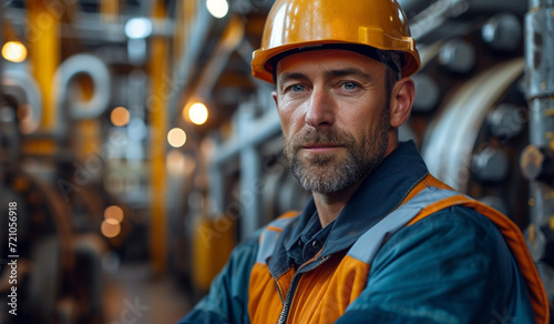 A man in a hard hat and orange vest standing in a factory. Generative AI