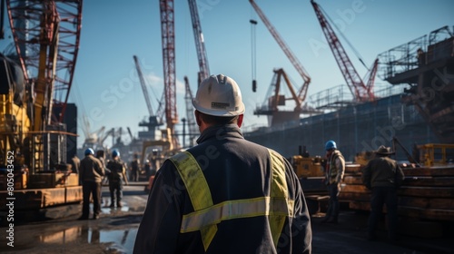 A man in a hard hat and safety vest is standing in front of a large crane.