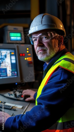 A man in a hard hat and safety vest stands confidently by a control panel, overseeing operations with a focused expression