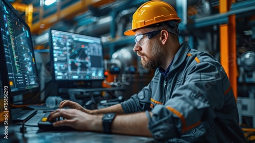 A man in a hard hat is focused on his computer screen, concentrating on engineering tasks.