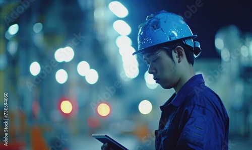 A man in a hard hat is holding a tablet. Generative AI.